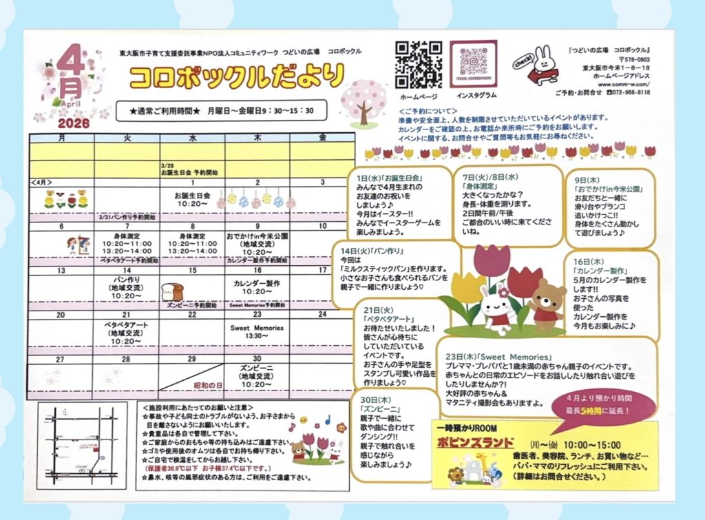 4月のおたよりが完成しました‼︎ 大人気のイベントがたくさんの4月です🌸 4月も、親子で楽しめるあそびや、ほっとできる時間をお届けできるようにいろいろな内容を詰め込んでいます😆 はじめましてのお友だちも、いつも来てくれているお友だちも、みんなで楽しい時間を過ごしましょう💕 ぜひチェックしてみてください💌